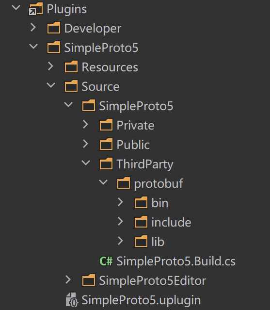 把这三个东西放到插件目录下,我的插件名叫SimpleProto5SimpleProto5,我放到了插件/Source/SimpleProto5/ThirdParty/probuf插件/Source/SimpleProto5/ThirdParty/probuf下:
